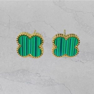 Gold ear plugs with a green clover. The earrings are stainless steel and are gold plated.