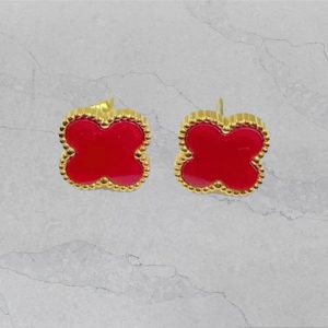 Gold ear plugs with a red clover. The earrings are stainless steel and are gold plated.