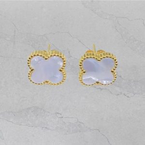 Gold ear plugs with a white clover. The earrings are stainless steel and are gold plated.