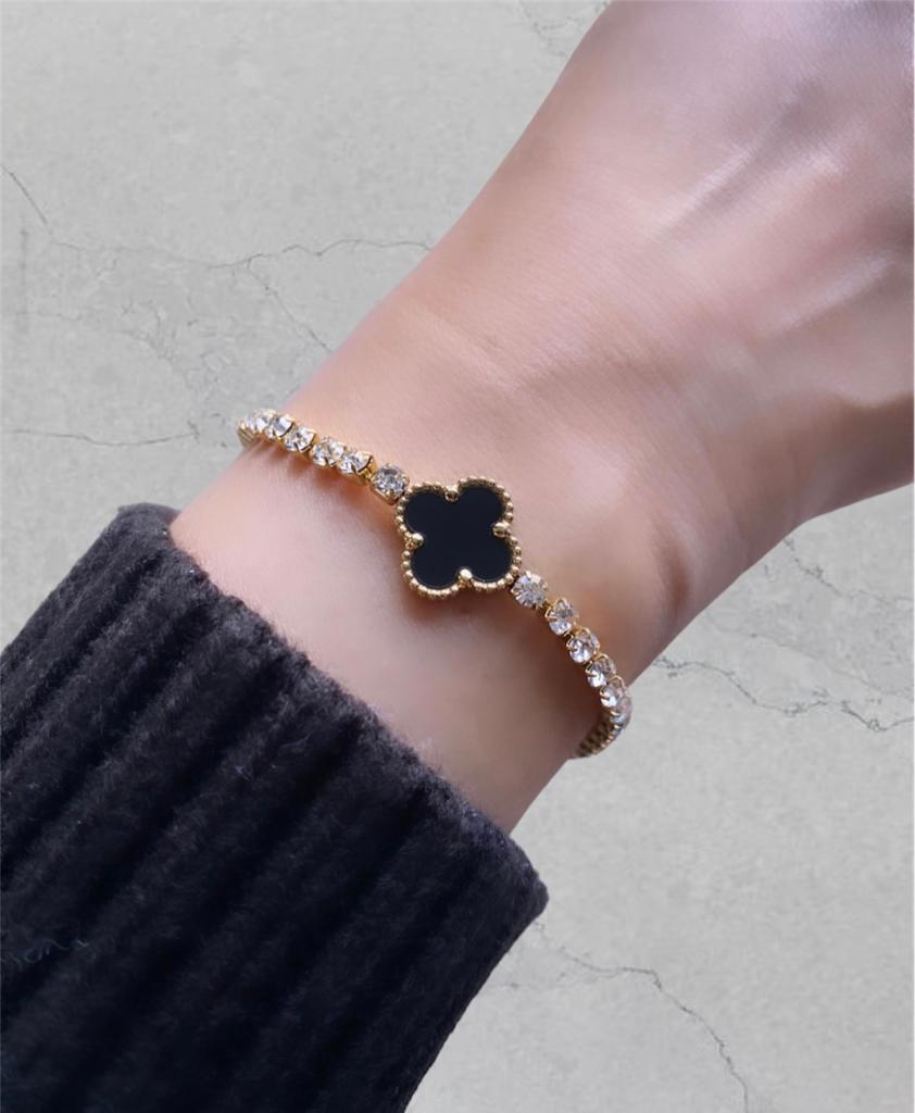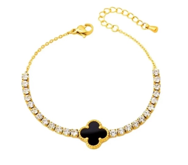 Gold bracelet with a black clover and zircone diamonds. The bracelet is made of stainless steel.