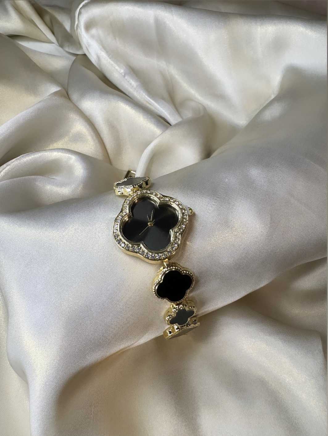 This elegant wristwatch features a black clover-shaped dial with sparkling crystals and a gold-tone finish. Made from durable copper, the bracelet includes removable pins for easy resizing. Powered by reliable quartz movement, this watch is both stylish and practical—perfect for any occasion