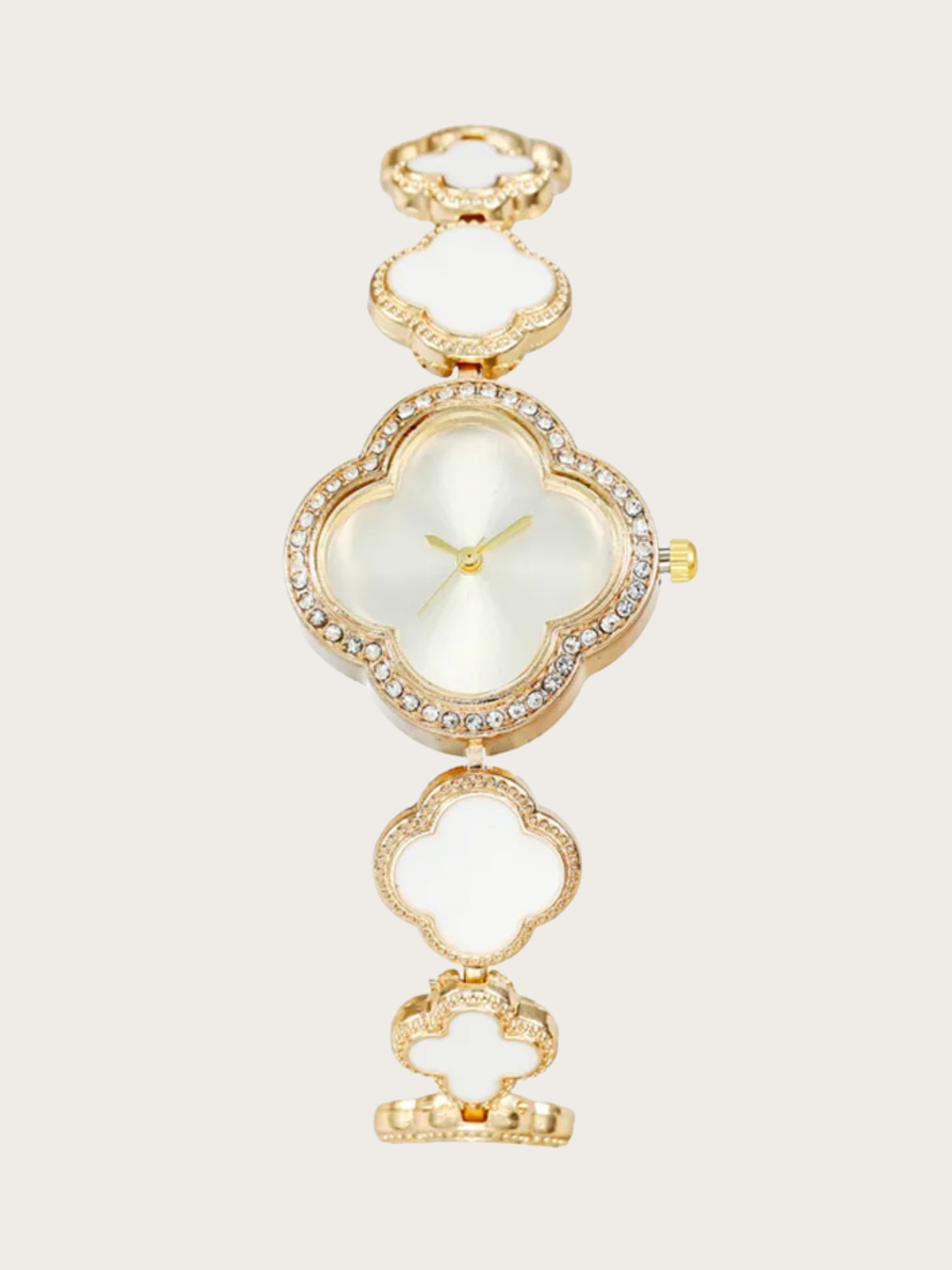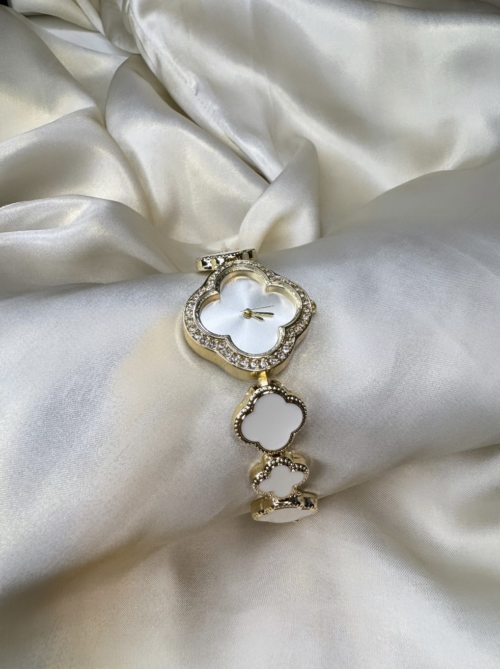 This elegant wristwatch features a white clover-shaped dial with sparkling crystals and a gold-tone finish. Made from durable copper, the bracelet includes removable pins for easy resizing. Powered by reliable quartz movement, this watch is both stylish and practical—perfect for any occasion.