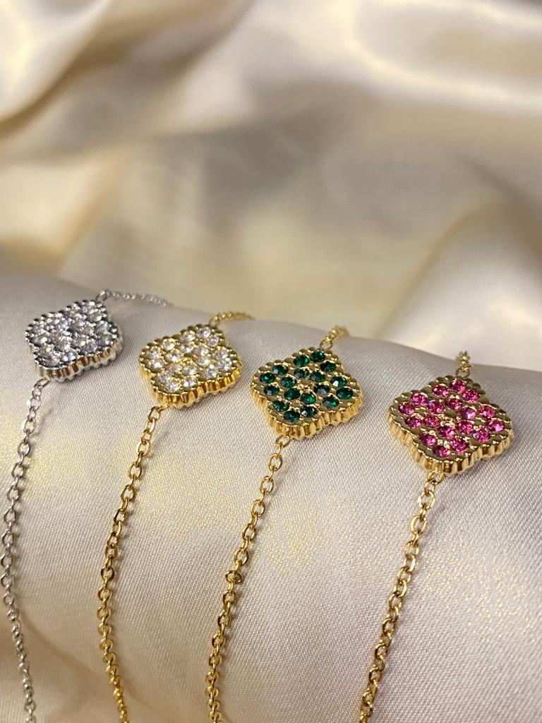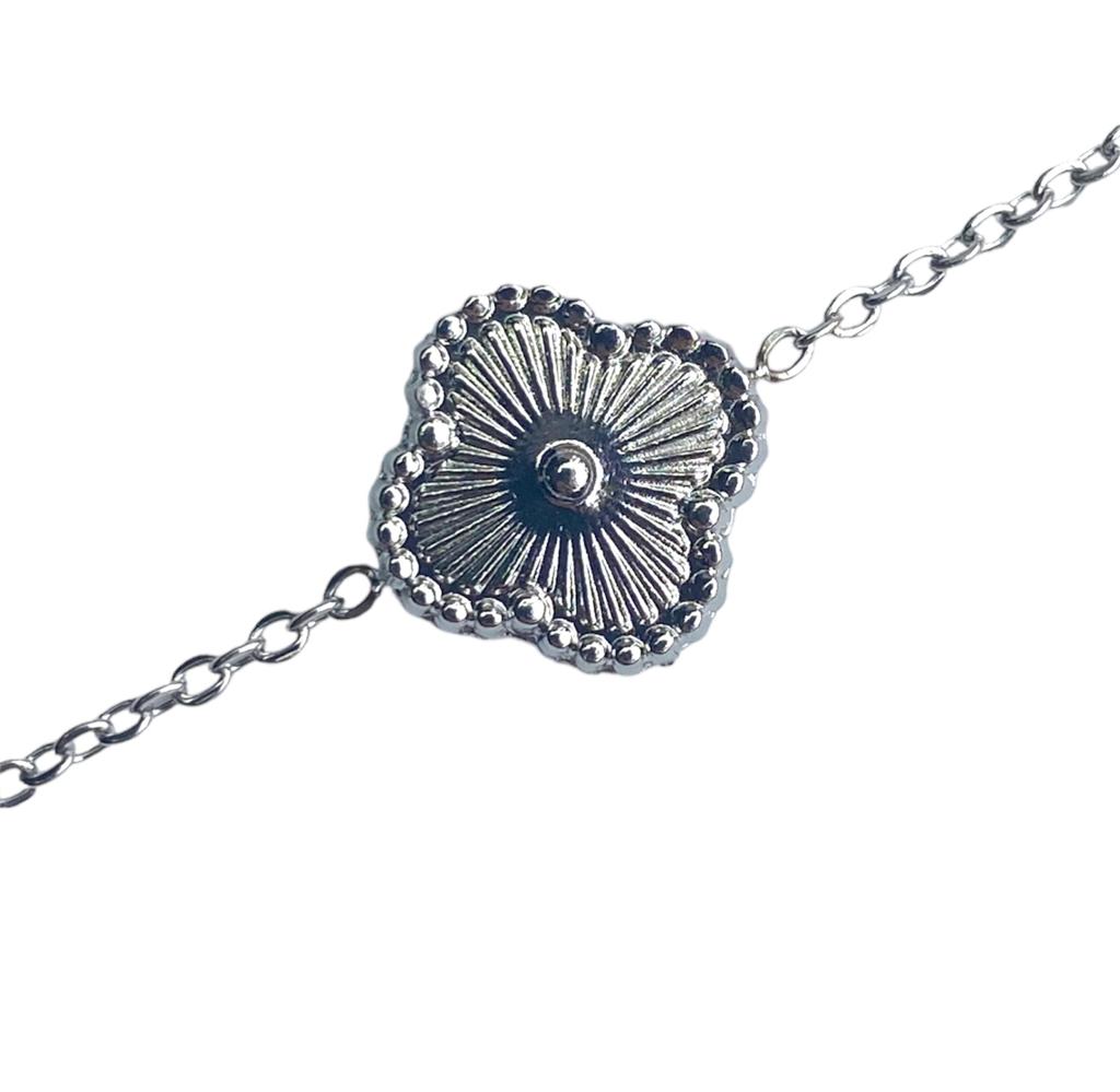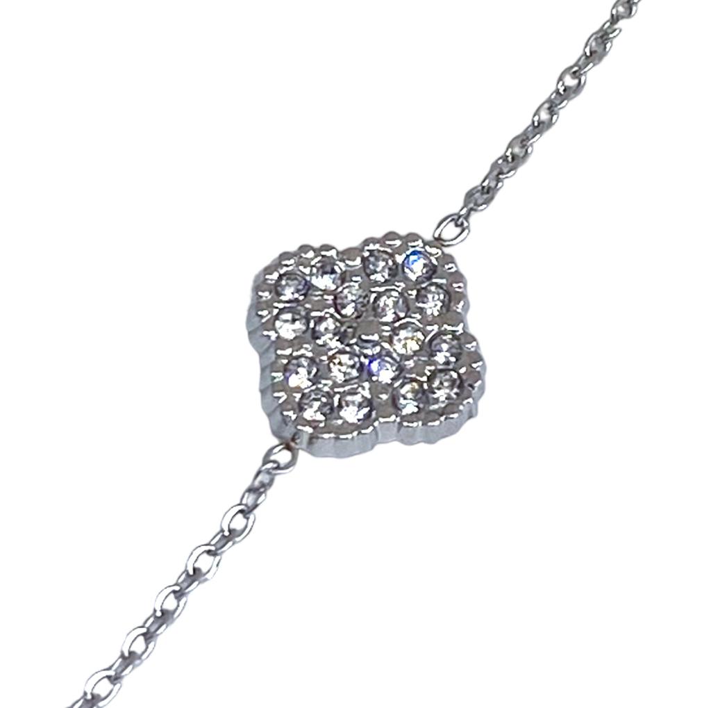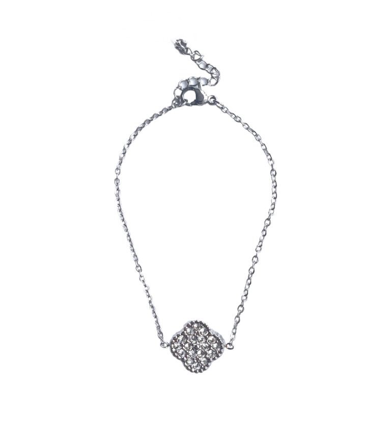 Silver bracelet with silver charm in the shape of a clover. The stones in the clover are rhinestones in the color silver. The bracelet is adjustable.