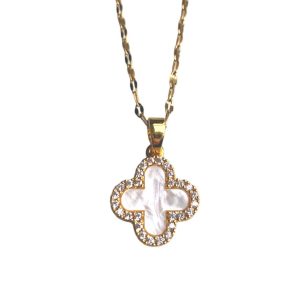 Gold necklace with a white clover. The stones in the clover are rhinestones in the color white. This necklace is made of stainless steel and has an adjustable clasp so you can wear it from 40 to 45 cm.