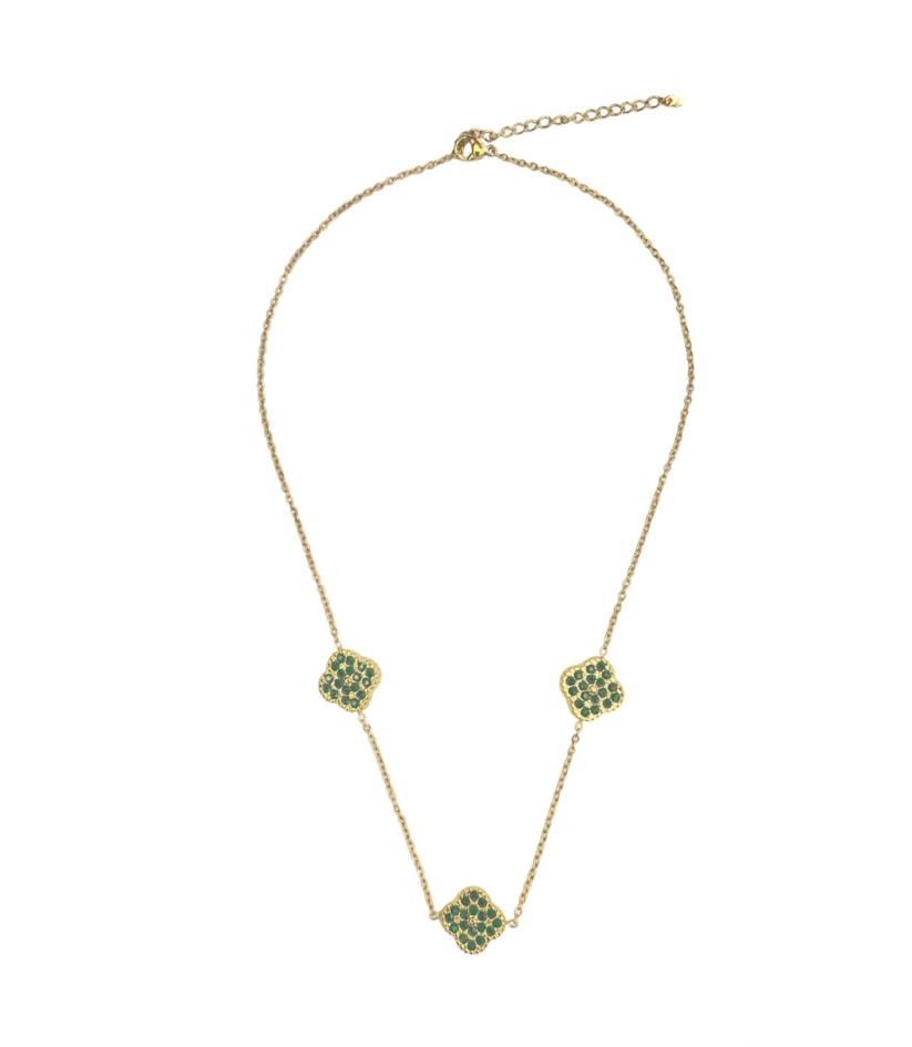 Gold necklace with three green charms in the shape of a clover. The stones in the clover are rhinestones in the color green. This necklace is made of stainless steel and has an adjustable clasp so you can wear it from 39 to 44 cm.