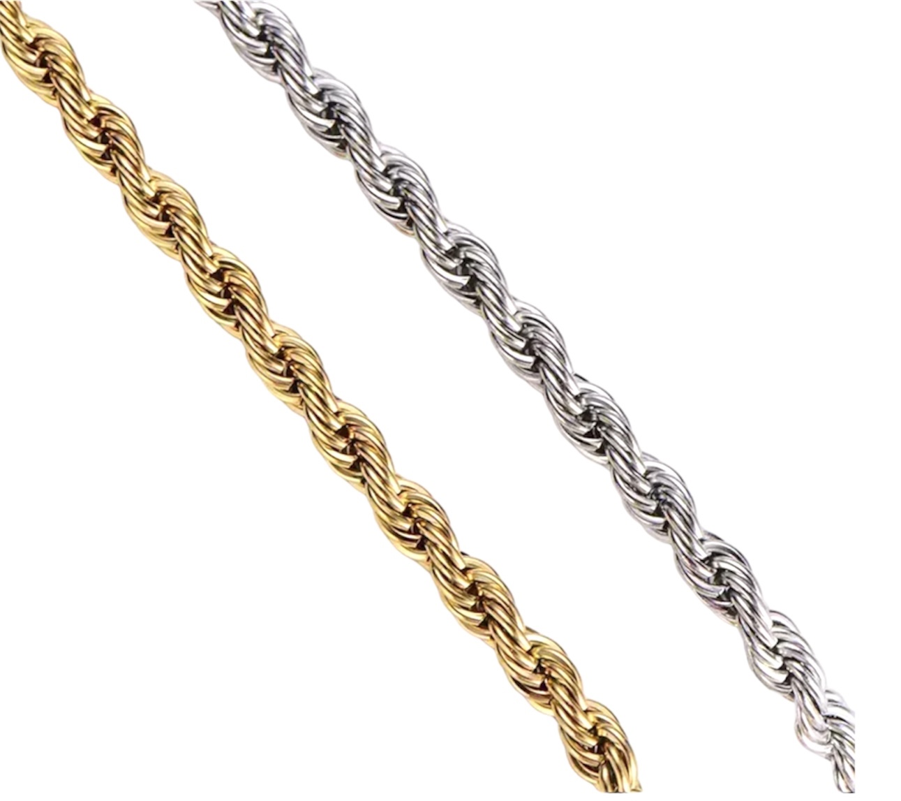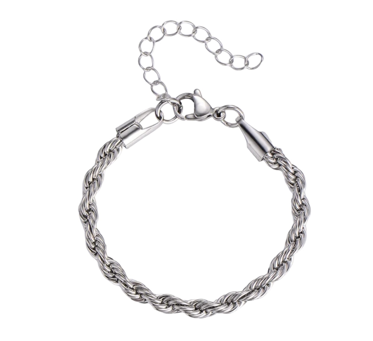 Rope bracelet silver. This bracelet is made of stainless steel and will not fade.