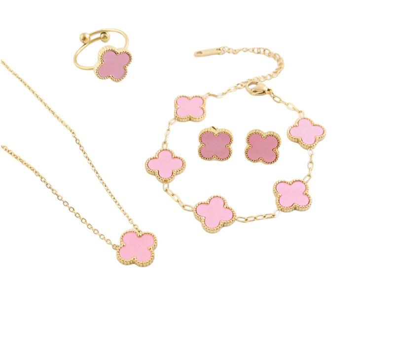 Gold bracelet with 5 clovers. The bracelet is stainless steel and is therefore waterproof. The bracelet is 18k gold plated and is adjustable.