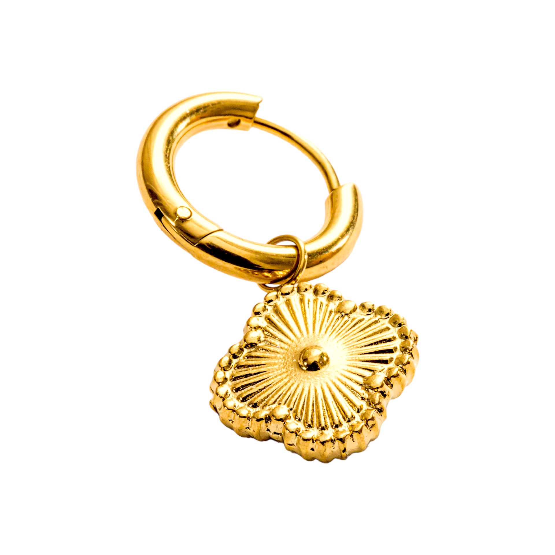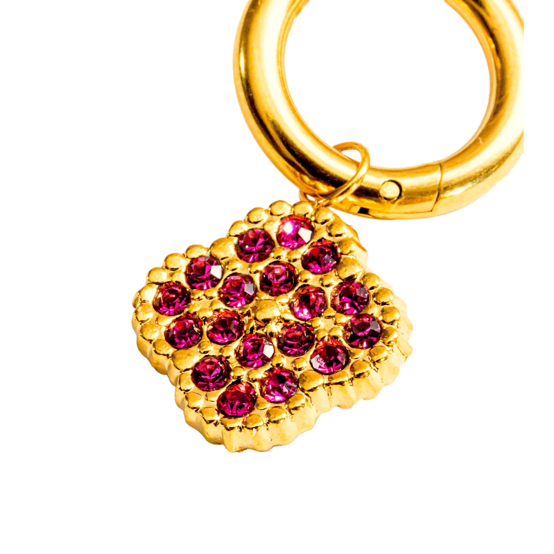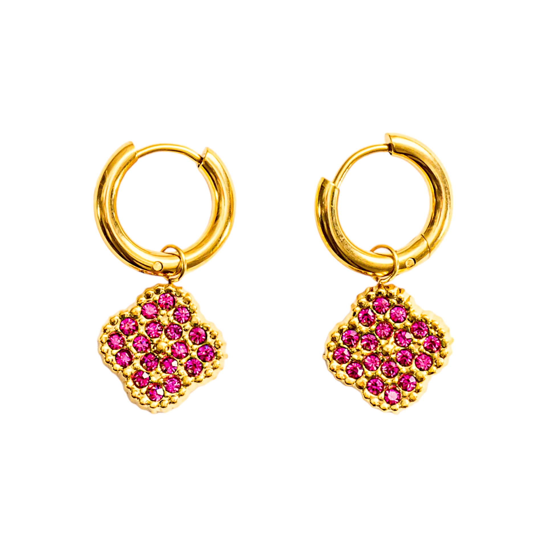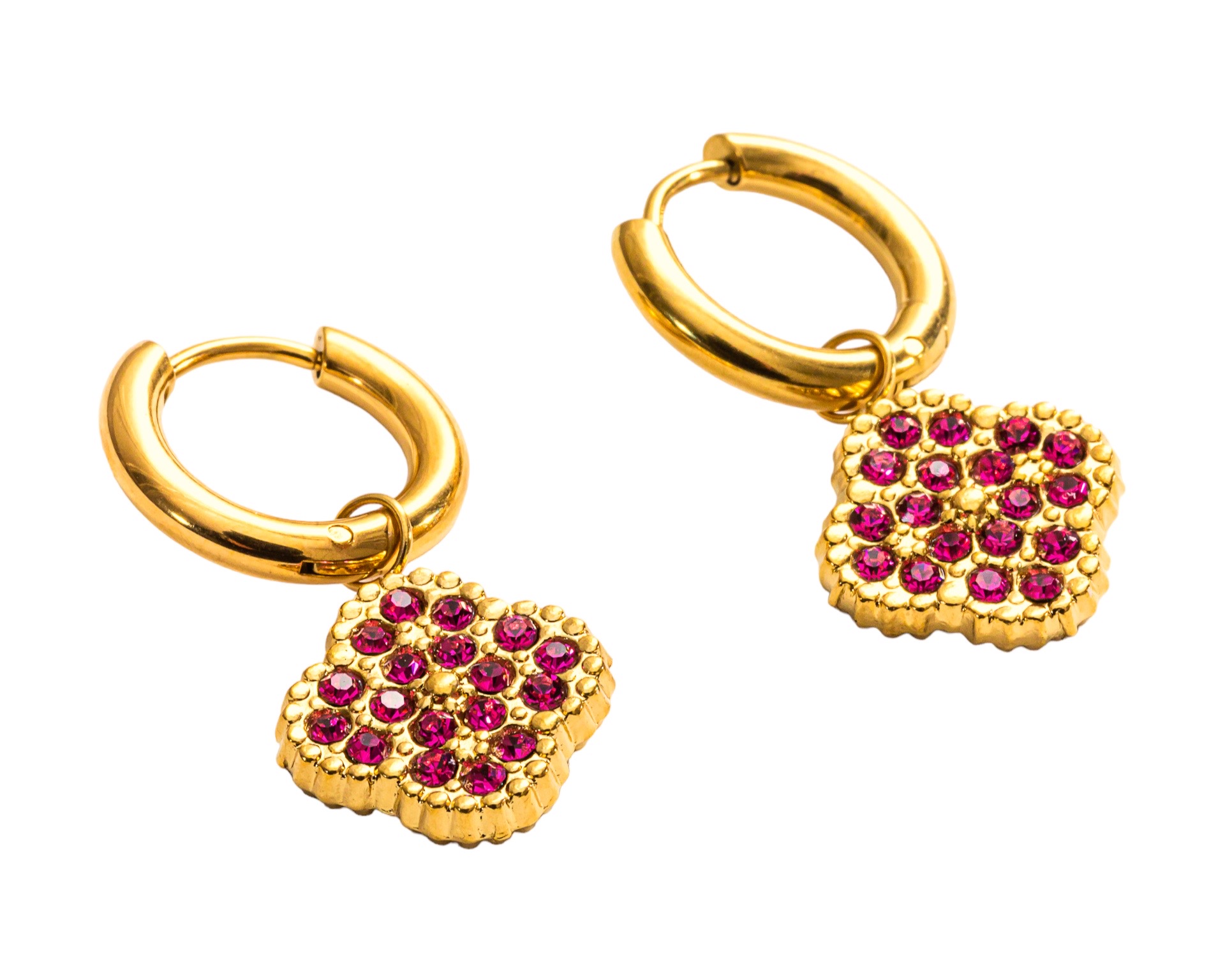 Gold stainless steel hoops with gold clover charm. The stones in the clover are rhinestones in the color magenta.