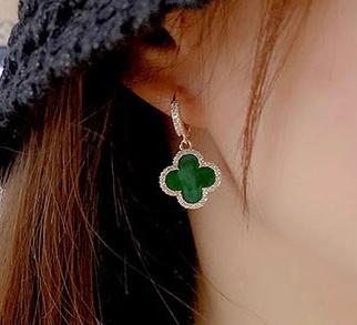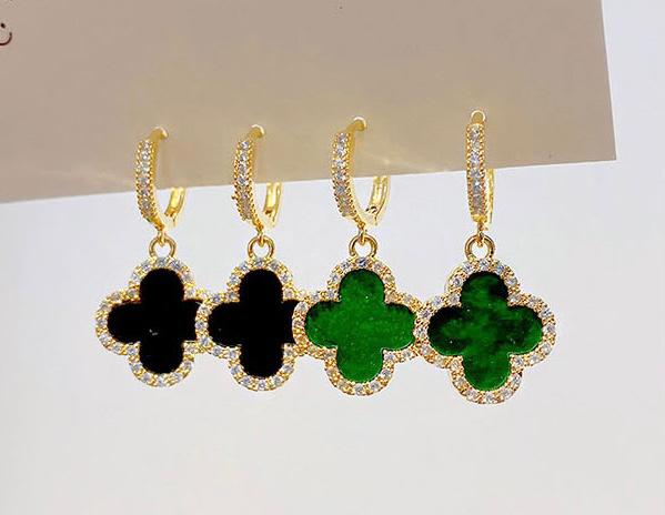 Gold earrings with a Green clover. The stones around the clover are rhinestones.